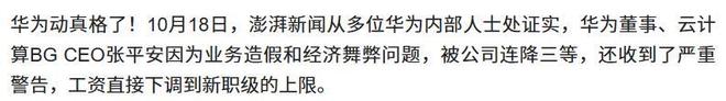 据《澎湃新闻》、《凤凰网财经》等多个媒体报道,华为常务董事、云计算BG CEO张平安被连降三等,薪资相应下调,同时云服务产品部、全球销售服务部与全球生态部三位部长也因管理失职被连降两等。这场针对云计算BU“系统性业务造假与经济舞弊”的问责,呈现出罕见的“自上而下”追责特征。