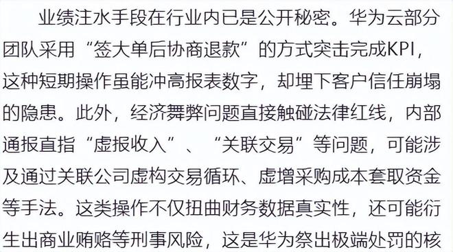 根据调查结果,华为云部分团队采用了“签大单后协商退款”的方式突击完成KPI。据《粼粼凛凛》等报道,这种操作手法虽然能够在短期内美化业绩报表,但却严重损害了业务的真实性和可持续性。经济舞弊问题更是直接触及法律红线。内部通报直指“虚报收入”、“关联交易”等违规行为,可能涉及通过关联公司虚构交易循环、虚增采购成本套取资金等手法。这类行为不仅扭曲了财务数据的真实性,更可能衍生出商业贿赂等刑事风险。