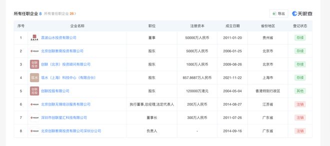 天眼查App显示,路行名下共关联8家企业,其中5家为存续状态,包括荔波山水投资有限公司、北京创联教育投资有限公司等,涉及教育投资、科技等领域,路行在上述公司担任董事或持有股份。