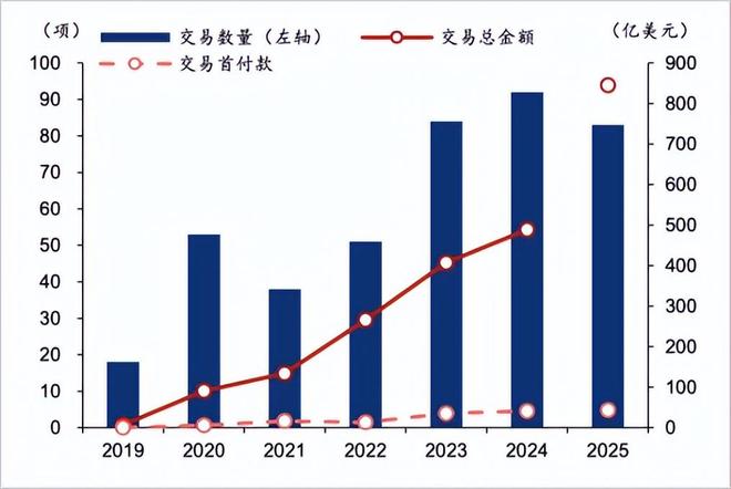 除起步估值偏低外,这波创新药行情的导火索是中国药企BD交易进展迅猛。这在一定程度上对冲了国内集采压力。据医药魔方,截至8月底,中国创新药license-out交易数量为83项,总金额为845亿美元,占全球半壁江山,规模远超2024年全年的488亿美元。