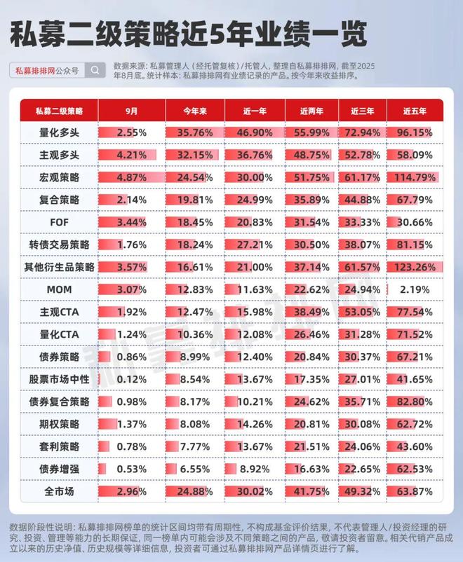 公司角度来看,截至2025年9月底,在私募排排网有3只以上产品有业绩展示的量化私募共有176家,今年前三季度的收益均值为25.89%,其中仅3家私募出现略微负收益,量化私募的年内正收益占比高达98.29%。