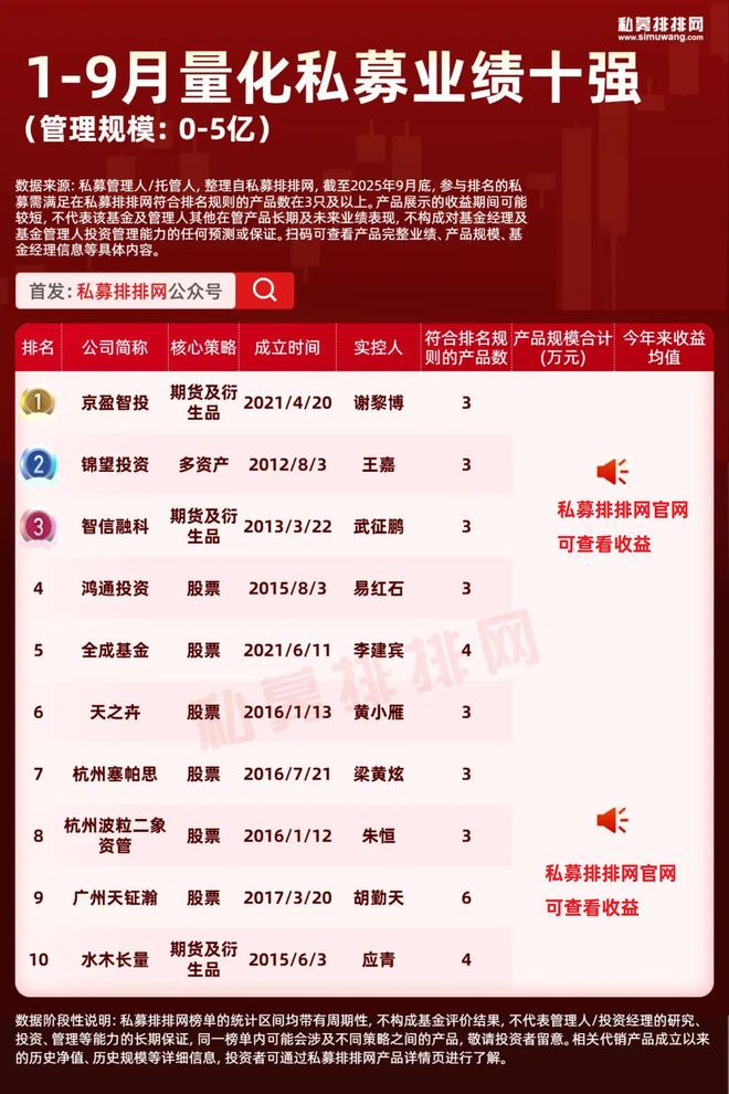 私募排排网数据显示,截至2025年9月底,5-10亿量化私募旗下符合排名规则的产品共353只,规模合计约为131.81亿元,今年前三季度收益均值为23.23%。今年来收益均值位居前三的分别是:京盈智投、锦望投资、华澄私募。