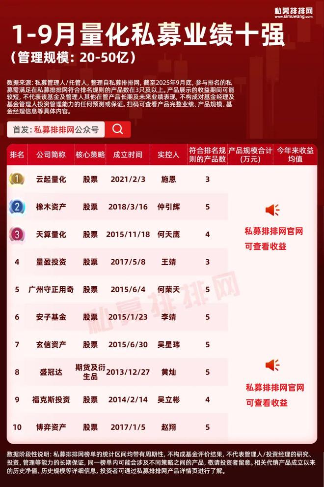 20-50亿:云起量化、橡木资产继续蝉联前二!