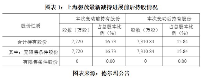 2025年半年报显示,上海磐茂是德尔玛第二大股东,持有该公司18.96%的股权。而最新的减持进展公告显示,经历过去两个半月的减持后,上海磐茂在德尔玛的持股比例已降至15.84%。根据此前的预披露公告,上海磐茂的减持计划尚未实施完毕。