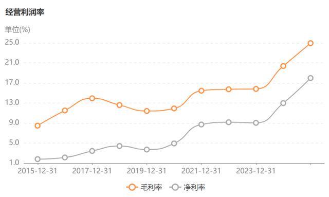 今年的毛利率已经高达25%,净利率也高达18%,相比于前些年,都不止翻了一倍。