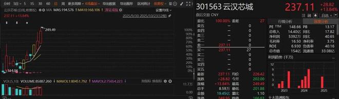 我们以次新股云汉芯城为例。该公司是国内最早一批推出电子元器件B2B线上商城并以此开展业务的企业之一,目前已成为我国电子元器件领域B2B领军企业。公司股票于9月30日在深交所创业板挂牌上市,发行价27元/股,首日收盘价即达116.8元/股。之后云汉芯城继续大涨,今日收盘价已较上市首日收盘价再次翻倍。