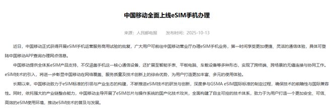 中国移动则表示,广大用户可前往中国移动营业厅办理eSIM手机业务,具体可登陆中国移动App查询办理网点信息。