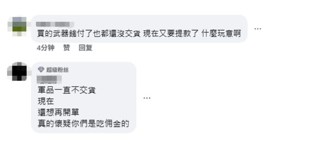 有关美参院外委会通过“豪猪法案”的消息传出后,一些岛内网民在社交媒体脸书留言表示,“买的武器钱付了也都还没交货,现在又要提款了,什么玩意啊。”“军品一直不交货,现在还想再开单,真的怀疑你们是吃佣金的。”
