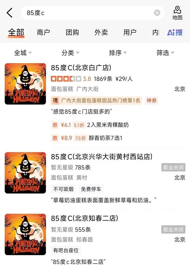 北京商报小编在大众点评搜索发现,北京目前仅85度C北京白广门店仍在营业。