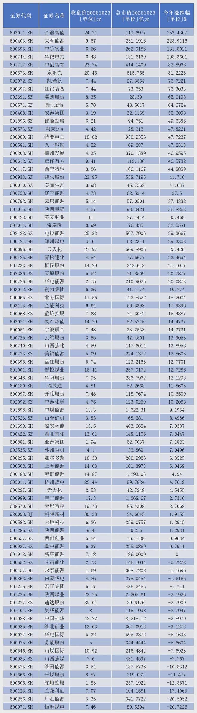 10月23日,煤炭股冲高,陕西黑猫(601015.SH)、山西焦化(600740.SH)、云煤能源(600792.SH)、上海能源(600508.SH)、郑州煤电(600121.SH)、大有能源(600403.SH)、安泰集团(600408.SH)、辽宁能源(600758.SH)等多股触及涨停。