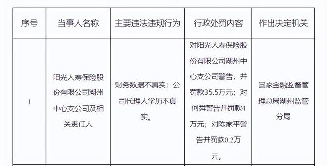 时光回溯至10月21日,阳光人寿湖州中心支公司因财务造假以及代理人学历造假等严重问题,国家金融监督管理总局湖州监管分局对阳光人寿保险股份有限公司湖州中心支公司警告,并罚款35.5万元;对何舜警告并罚款4万元;对陈家平警告并罚款0.2万元。