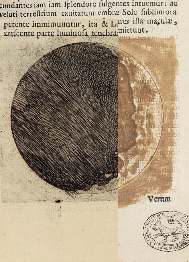 左侧是《星际信使》初版,月球的图像是以黑色蚀刻版印制的。而右侧的伪本则使用了棕色水彩绘制
