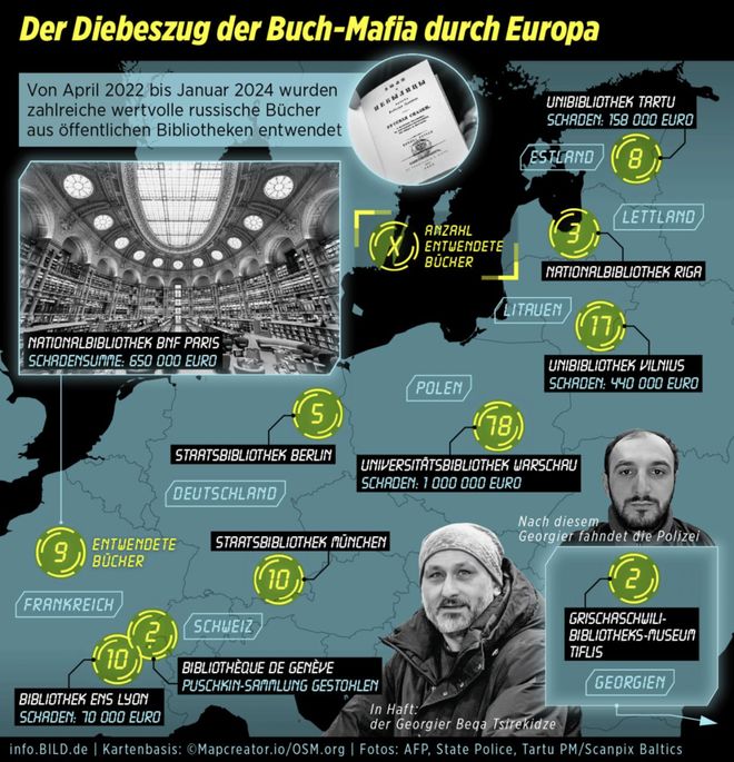 根据警方调查,Mikheil Zamtaradze在立陶宛维尔纽斯大学图书馆窃取了17本俄语珍贵书籍。法国国家图书馆馆藏主管也发现,这位老哥在半年内造访了40次,所借阅过的9本珍贵书籍被换成了伪本。