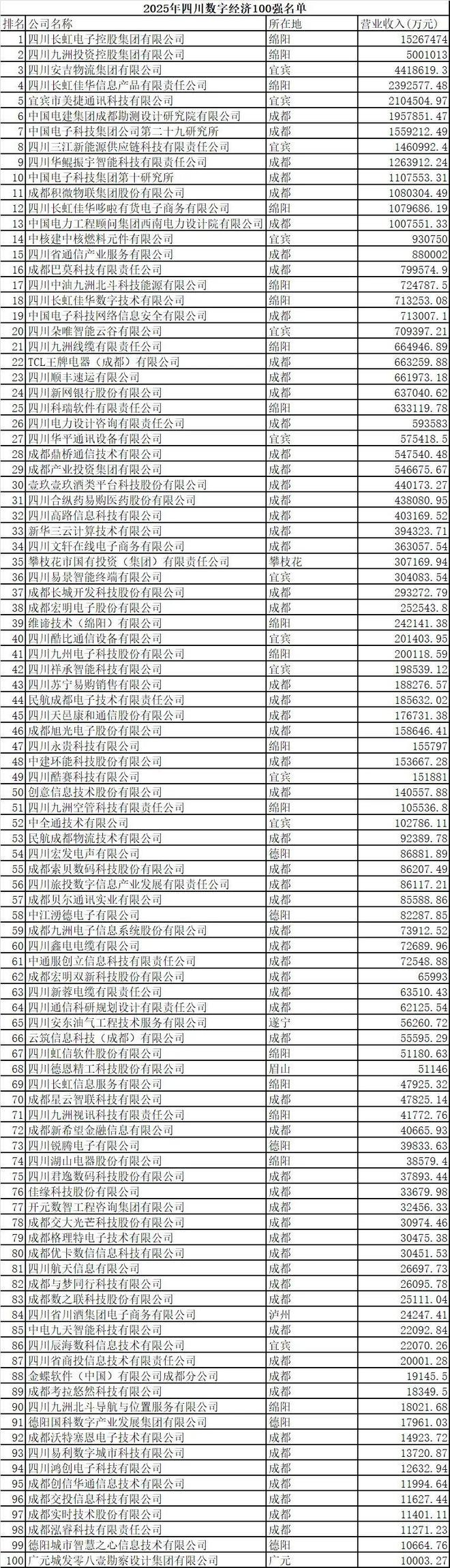 据了解,2025年四川企业100强由四川省企业联合会、四川省企业家协会连续第22年发布。会上,四川省企业联合会推出《四川100强企业发展报告(2025)》。发展报告收录2025年四川100强企业、制造业100强企业、建筑业100强企业、服务业100强企业、数字经济100强企业名单和中国500强企业名单数据及分析报告,主要对百强企业整体规模、效益、所有制和地区差异等方面进行分析,并提出发展建议等。