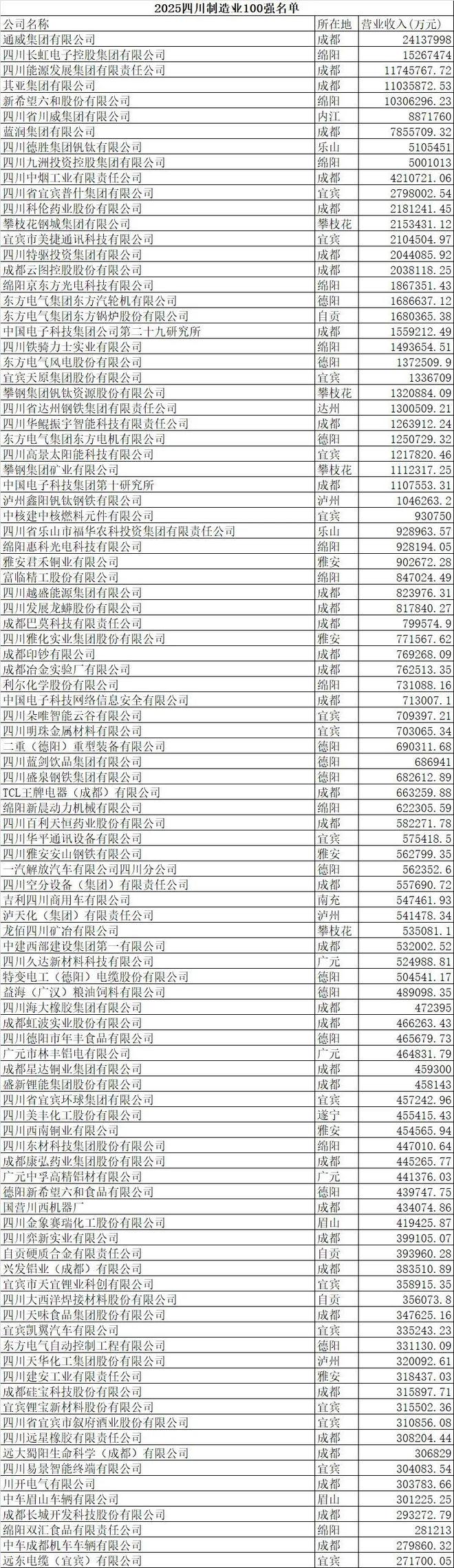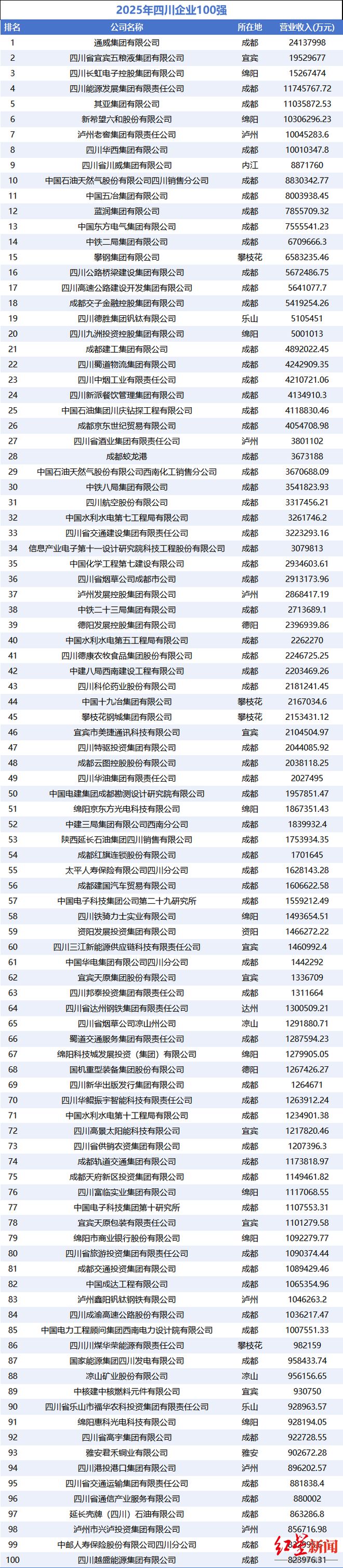 在“2025四川企业100强”榜单中,通威集团、五粮液集团、长虹控股集团、四川能源发展集团、其亚集团、新希望六和、泸州老窖、华西集团、川威集团、中国石油四川销售公司位列前十名。成都共计有64家企业上榜。