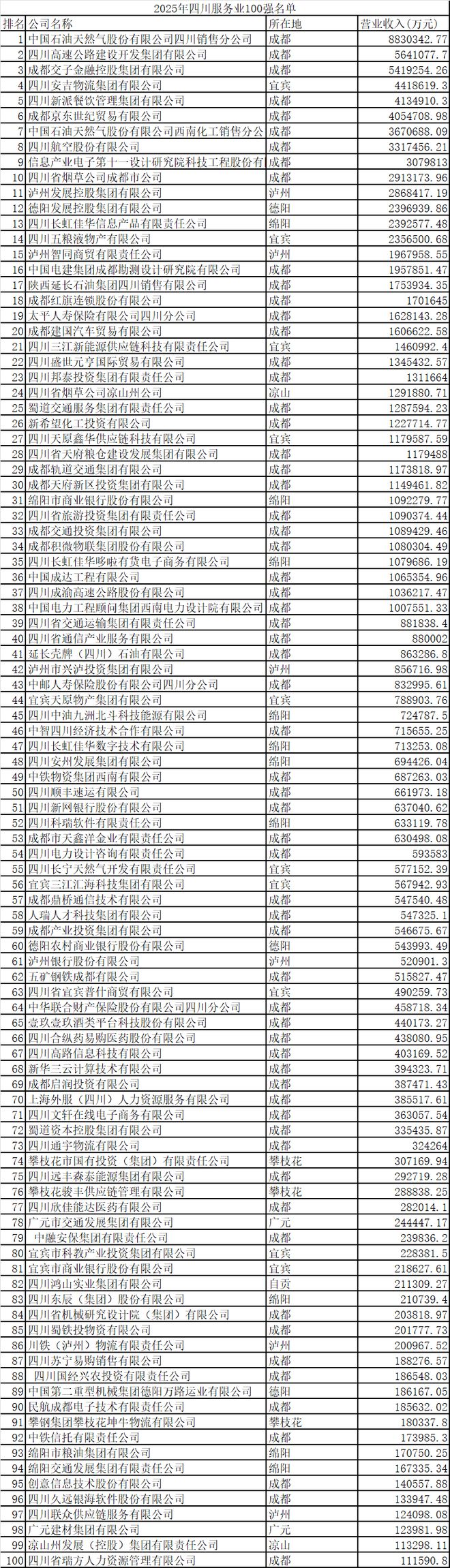 中国石油四川销售公司、四川高速公路建设开发集团、交子金控、安吉集团、新派餐饮管理集团位列四川服务业100强企业前五名;