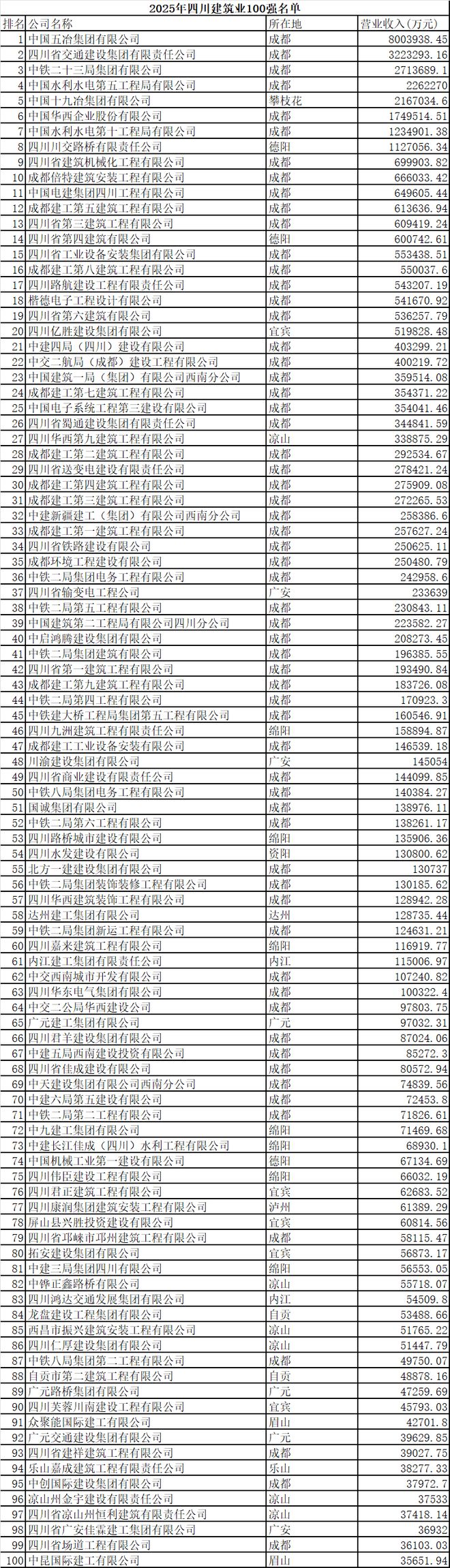 中国五冶集团、四川交建集团、中铁二十三局集团、中国水利水电第五工程局有限公司、中国十九冶集团位列四川建筑业企业100强前五名;