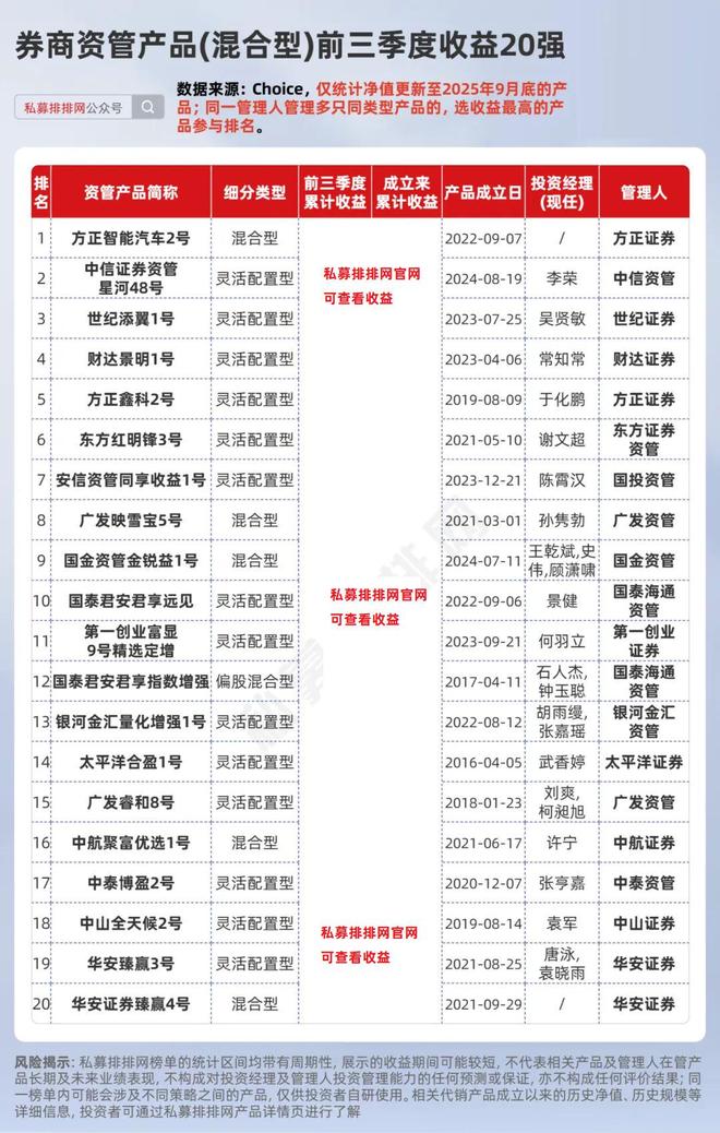 其中,方正证券旗下的产品“方正鑫科2号”,今年前三季度的收益超***%,位列第5。该产品成立于2019年8月9日,截至2025年9月30日,运作已超6年,累计收益超***%。
