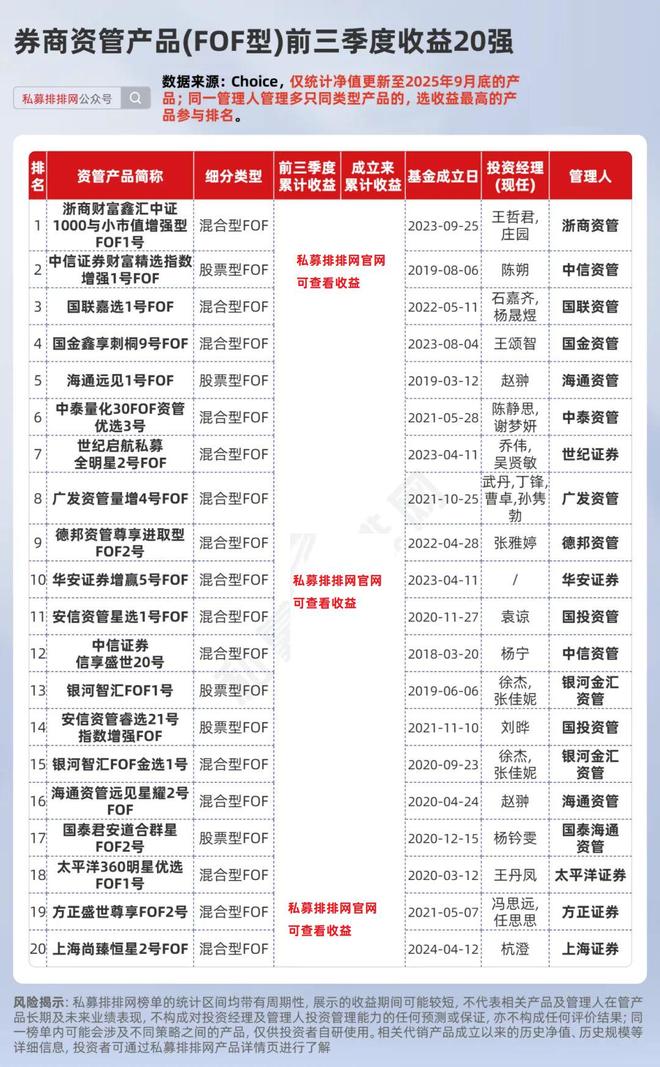 其中,中信证券资管公司旗下的产品“中信证券财富精选指数增强1号FOF”,今年前三季度收益超***%,位列第2。该产品成立于2019年8月6日,截至2025年9月30日,运作已超6年,累计收益超***%。