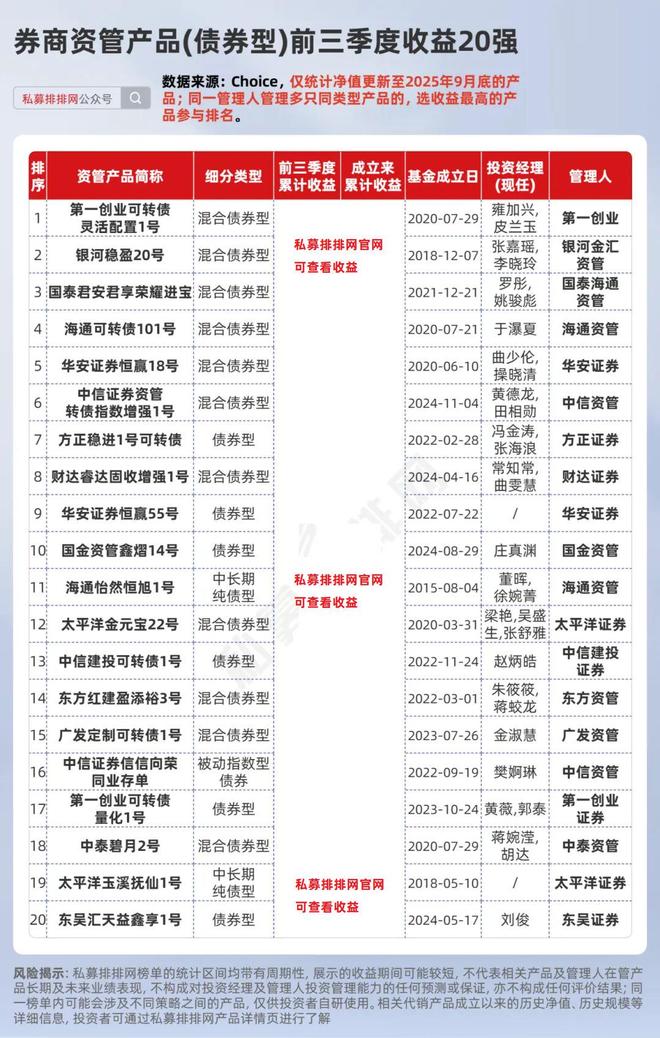 债券型券商资管产品今年前三季度收益前5名依次是:第一创业可转债灵活配置1号、银河稳盈20号、国泰君安君享荣耀进宝、海通可转债101号、华安证券恒赢18号。