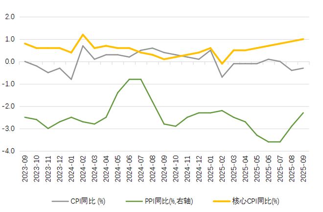 PPI降幅收窄,生产领域通缩压力减弱。前三季度,PPI比上年同期下降2.8%,其中三季度下降2.9%,降幅比二季度收窄0.3个百分点;单月PPI同比也由7月的-3.6%已收窄至9月的-2.3%。我国PPI同比已连续36个月低于0%,主要受部分行业需求偏弱、外部输入性价格传导及国际贸易不确定不稳定性等多重因素影响,但今年8-9月情况已有所好转。一是整治“反内卷”式竞争取得较好效果,市场竞争秩序得到改善。煤炭加工、黑色金属冶炼和压延加工业价格降幅比上半年分别收窄0.5个和1.7个百分点;光伏设备及元器件制造、锂离子电池制造、新能源车整车制造等价格同比降幅比上半年分别收窄2.0个、0.5个和0.4个百分点。二是国际有色金属价格上行带动国内相关行业价格上升。国内有色金属冶炼和压延加工业价格同比连续9个月上涨,前三季度平均上涨5.6%,其中以金冶炼价格上涨最大。三是在宏观政策持续加码下,高新技术产业加快发展推升行业价格。前三季度,数控金属成形机床、服务器、集成电路封装测试系列、半导体器件专用设备制造飞机制造等相关产品需求上升,价格同比上涨,先进制造领域发展全面提速。此外,提振消费政策也推升了升级类消费需求,带动可穿戴智能设备、工艺美术及礼仪用品等的价格。PPI同比虽然仍低于0%水平,但已呈现改善趋势,生产领域通缩压力有所缓解。