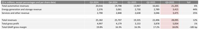 Q3,特斯拉总营收达到281亿美元,同比增长12%;其中,三季度汽车交付量达49.7万辆,同比增长7%,但汽车收入同比增长只有6%,不仅低于交付量,也低于整体收入增速。这说明,储能业务和服务业务对公司的收入贡献更加明显。往好的方面理解,这是公司业务多元化的体现;往坏的方面理解,特斯拉的汽车业务其实已经进入瓶颈期,很难带动公司进一步高速增长。