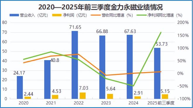 2025年前三季度,金力永磁实现营收53.73亿元,同比增长7.16%;实现净利润5.15亿元,已远超2024年全年水平,扣非净利润同比增速更是飙到381.94%。