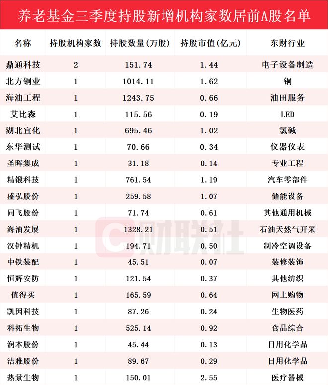 图为养老基金三季度持股新增机构家数居前A股名单