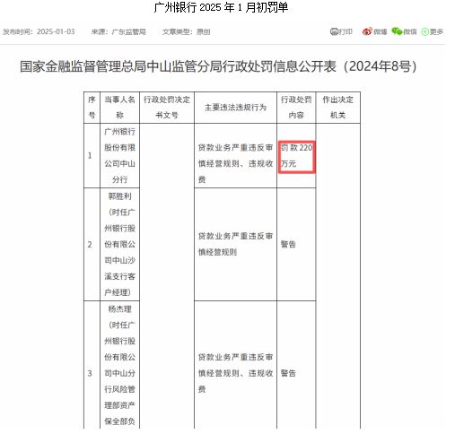 此外,广州银行的罚单问题亦不容忽视。今年1月,该行中山分行因贷款业务严重违反审慎经营规则、违规收费被罚款220万元,10名责任人被予以警告。