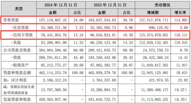 引人注意的是,信用卡贷款占据着该行零售信贷的最大比重。2024年末,该行信用卡贷款704.42亿元,同比下滑18.11%,但在零售信贷的占比达到44.83%。