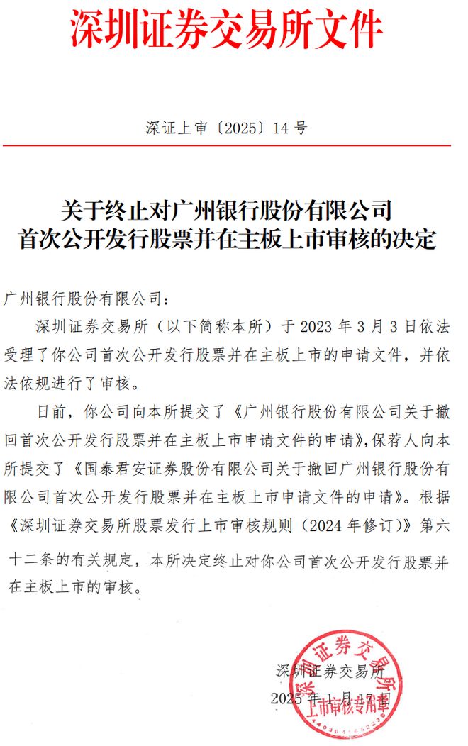 (图 / 深交所有关终止广州银行IPO审核的公告(来源:深交所网站))
