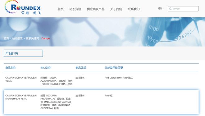 Campo官网信息显示,该公司专注于纯天然植物基功能性活性化妆品原料研发,经销商遍及中国、印尼、韩国、美国、意大利、加拿大等国家。