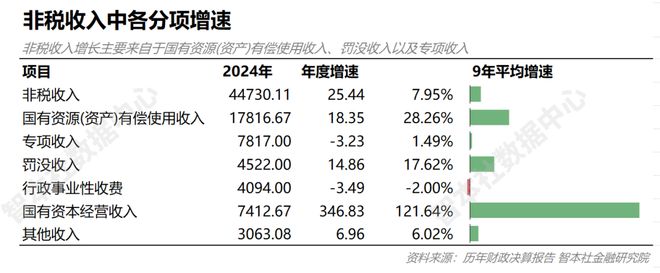 从财政部公布的数据来看,智本社的观点是完全正确的。2024 年全国非税收入达到 44730 亿元,较上年增长 25.4%。这笔大幅增长的非税收入,其最重要的原因并非市场此前担忧的罚没收入,而是国有资源有偿使用收入大幅度增加。