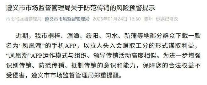 遵义市市场监督管理局年初发布的风险提示称,近期,我市桐梓、湄潭、绥阳、习水、新蒲等地部分群众下载一款名为“凤凰潮”的手机APP,以拉人头入会赚取工分的形式谋取利益,“凤凰潮”APP运作模式与组织、领导传销活动高度相似。