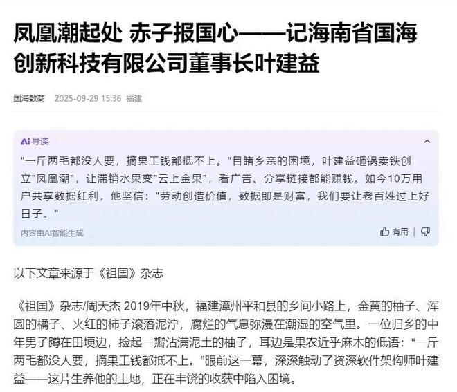 国海创新的法定代表人为叶建益,根据网上一篇名为《凤凰潮起处 赤子报国心——记海南省国海创新科技有限公司董事长叶建益》的文章:2023年2月21日,一款名为“凤凰潮”的聚合工具APP在贵州遵义正式上线。凤凰潮融合便民缴费、农产品直销、小微商家赋能、灵活就业等12大功能。在国海创新的蓝图中,凤凰潮不仅是一款工具,更是一个“振兴实体、服务大众”的开放式数字生态。