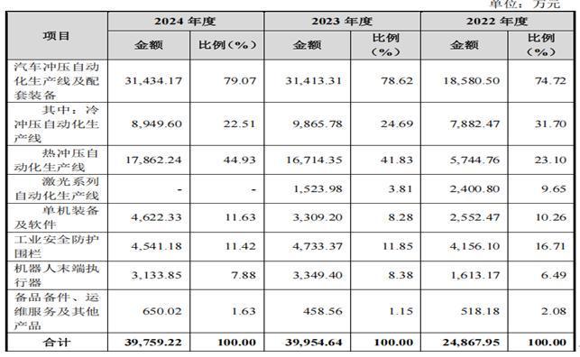 报告期内,奥图股份主营业务收入主要来自于汽车冲压自动化生产线及配套装备、工业安全防护围栏和机器人末端执行器等产品,其中汽车冲压自动化生产线及配套装备是公司的主要收入来源,2022年-2024年收入占比分别为74.72%、78.62%和79.07%,逐期提升。