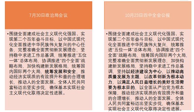 本次公报在总体基调在延续7月30日中央政治局会议基础上,在实现“推动经济实现质的有效提升和量的合理增长”的目标下重申“坚持以经济建设为中心”。以经济建设为中是党的十三大以来,我国确立的社会主义初级阶段基本路线的核心内容。根据2035年远景目标,人均国内生产总值达到中等发达国家水平。“十四五”规划中没有制定具体的增长目标,具体要求是“保持合理区间、各年度视情提出”。“十四五”期间实际完成情况看,2021年增长8.6%(两年内平均5.1%)、2022年增长3.10%、2023年增长5.40%,2024增长年5.0%,今年《政府工作报告》确立的增长目标为5.0%左右,目前,前三季度5.2%,全年目标完成问题不大。“十五五”是新“两步走”第一个十五年的中间五年,要保持一定合理的增速,才能实现2035远景目标。预期会延续不制定具体增长目标,但年度仍有“量的合理增长”的诉求,年度实际增速将较“十四五”整体保持平稳态势。