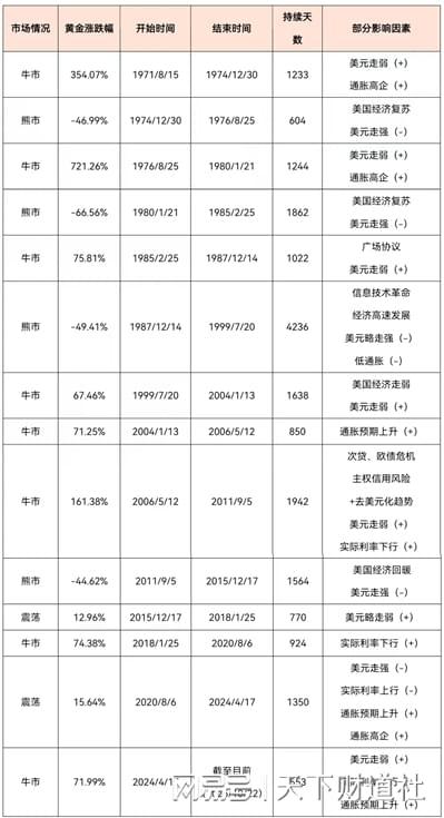 驱动黄金价格的因素比较复杂,其价格波动也难有一般规律可循,一次起落周期有时很长、有时很短。例如下面所列不同时期对黄金走势的部分影响因素,黄金市场每一轮牛熊变换背后的原因都各不相同。