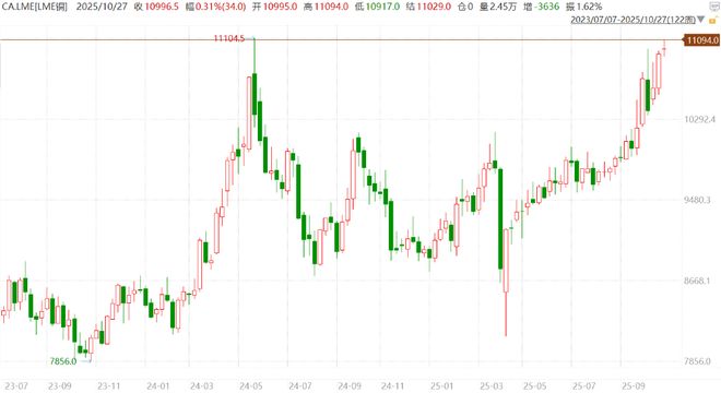 此前从南美到印度尼西亚的矿山生产受阻,加剧了市场对供应的担忧。周一伦敦金属交易所铜价一度上涨1.2%至每吨11094美元,距离2024年5月创下的历史高点仅差约10美元,随后涨幅有所收窄。