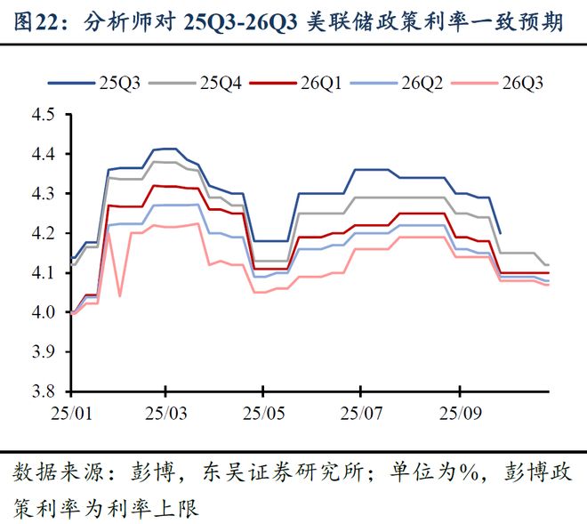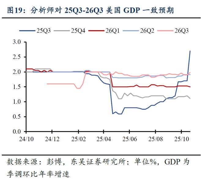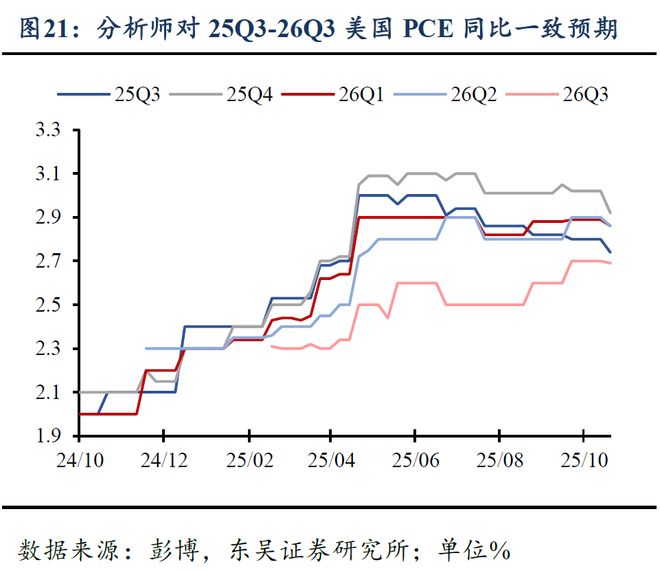 市场预期:分析师上调25Q3美国GDP预期,下修美国通胀预期。本周彭博更新了分析师对美国经济和货币政策的市场调查。根据彭博在10月17-22日对84名经济学家的问卷调查结果,增长方面,分析师显著上修25Q3美国增长预期,当前分析师一致预期25Q3-26Q4美国GDP季环比年率增速分别为2.8→1.1→1.5→1.9→2.0→2.0%,对25Q3预期相较上月大幅上修,对25Q4、26Q1的预期略有下修。通胀方面,分析师小幅下修2026年通胀预期,最新分析师一致预期25Q3-26Q4美国PCE同比增速分别为2.7→2.9→2.8→2.8→2.7→2.5%,其中对25Q3-26Q2的预测值均小幅下修0.1%。货币政策方面,最新分析师一致预期美联储将在10月29日、12月10日两次FOMC会议上各降息25bps,年底政策利率上限将下调50bps至3.75%;同时预测美联储将在明年3月、7月两次FOMC会议上各降息25bps,到2026年底政策利率上限将降至3.25%,这一预期相较当前市场联邦基金期货交易员预期的明年3次降息略为保守。