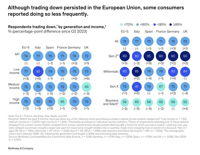 McKinsey 在此前的一份报告指出,截至2024年秋末,欧洲五国的Z世代和千禧一代消费者中,高达80%至95%的人表示有降级消费行为。相比之下,X世代及前三个世代中,仅有52%至81%的人正在降级消费。