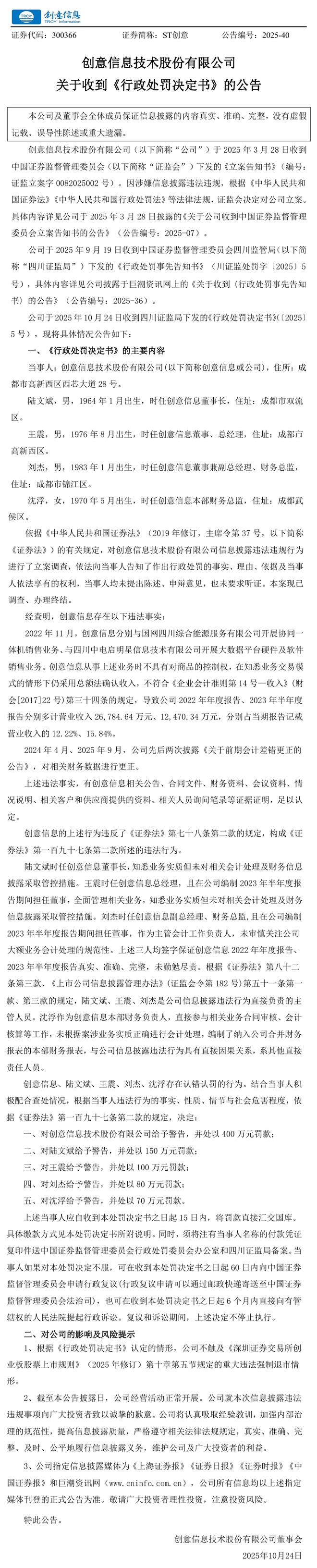 2025年10月24日晚,ST创意(创意信息,300366.SZ)公告,公司收到四川证监局下发的《行政处罚决定书》。此前的2025年3月28日,公司公告,因涉嫌信息披露违法违规,中国证监会决定对其立案。
