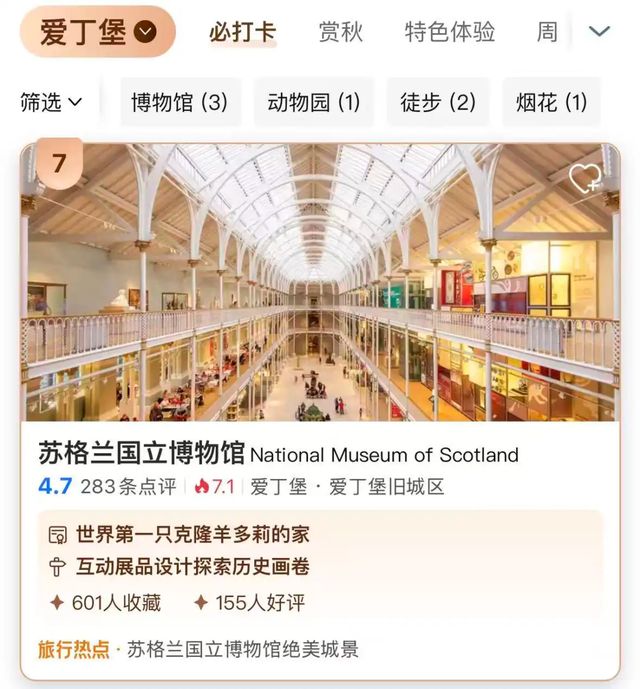 例如,一位英国驻地向导对“爱丁堡必打卡景点榜”的上榜项目苏格兰国立博物馆提供了关键信息:由于顶层不常开放,且部分历史文物不可亲手操作互动,建议将该景点的推荐重点放在“世界第一只克隆羊多莉的标本所在地”与“家庭友好的科技互动展品”上,使信息更贴近真实体验。