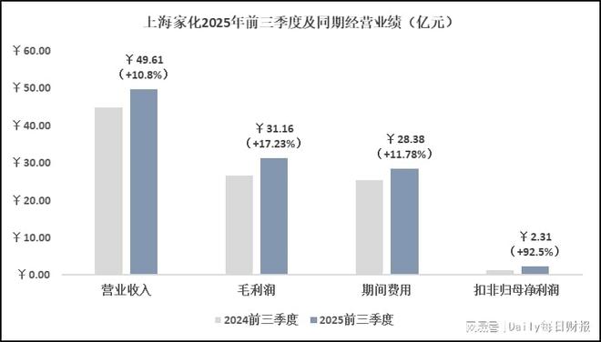 2025年前三季度,上海家化实现毛利润31.16亿元,同比增长17.19%,同期的期间费用支出同比增幅为11.78%,低于毛利增速;开源节流并举之下,前三季度扣非归母净利润同比增长92.5%,录得2.31亿元;毛利率较同期提升3.4个百分点,为62.81%。
