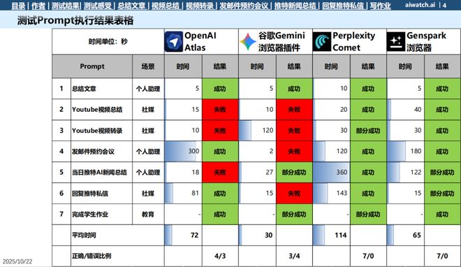 根据自媒体博主郎瀚威于2025年10月22日发布的测试报告,在对文本总结、视频总结、邮件处理及社交媒体相关等用户高频任务进行测试时,Atlas虽能完成基础操作,但在面对稍复杂的任务时成功率明显下降。