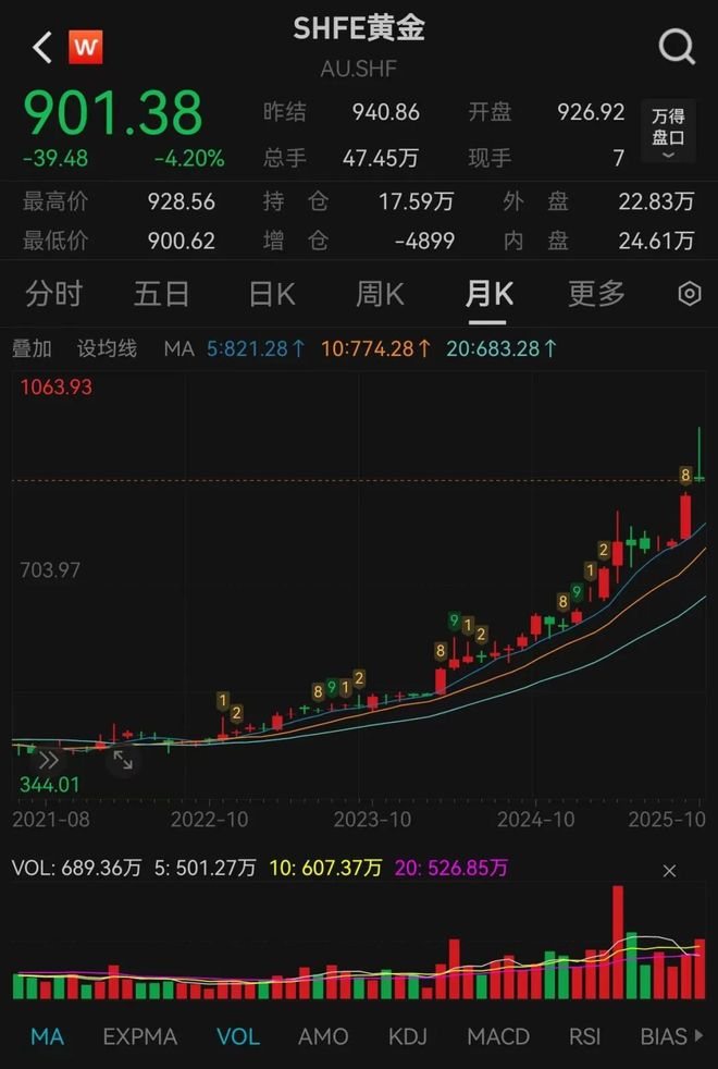 而沪金今年涨幅逼近60%,最新涨幅44%,最新报901元/克,今年最高价是1002元左右。