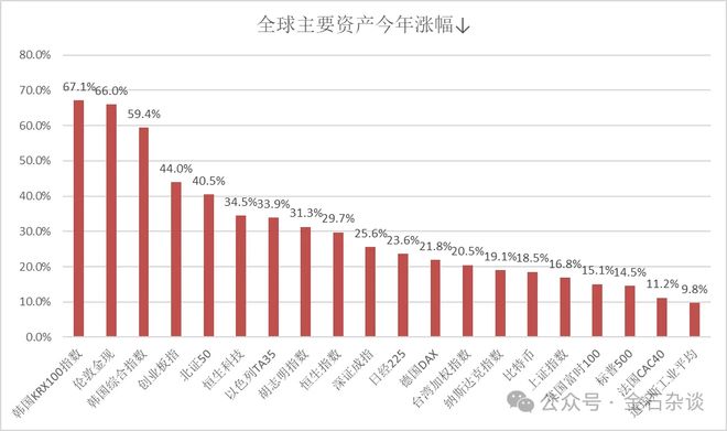 在黄金最高点时,金石杂谈曾做过一个统计,黄金现货涨幅高达66%,一度逼近4400美元大关,在主要大类资产中仅次于韩股。