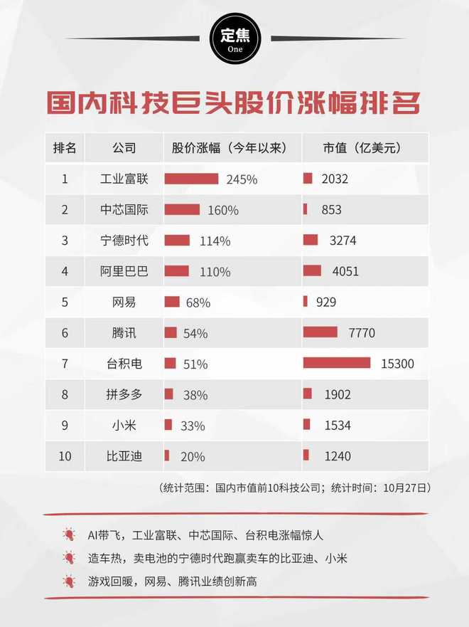 中国市值前10科技公司中,工业富联以245%的股价涨幅(今年以来)一骑绝尘,中芯国际、宁德时代涨幅也超过100%,AI、新能源汽车大潮来势汹汹,硬科技股爆发力属实强悍;阿里、腾讯、网易则靠电商复苏与游戏增长稳居第一梯队,拼多多、小米亦在各自赛道展现韧性。