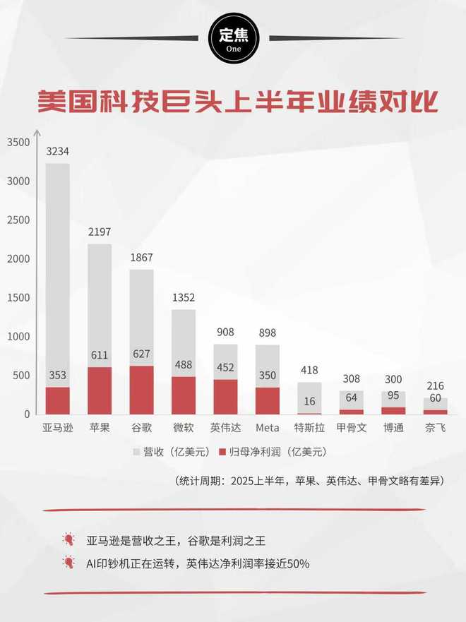 业绩维度,亚马逊以半年3234亿美元稳坐营收之王,谷歌则以半年627亿美元成为净利润之王。