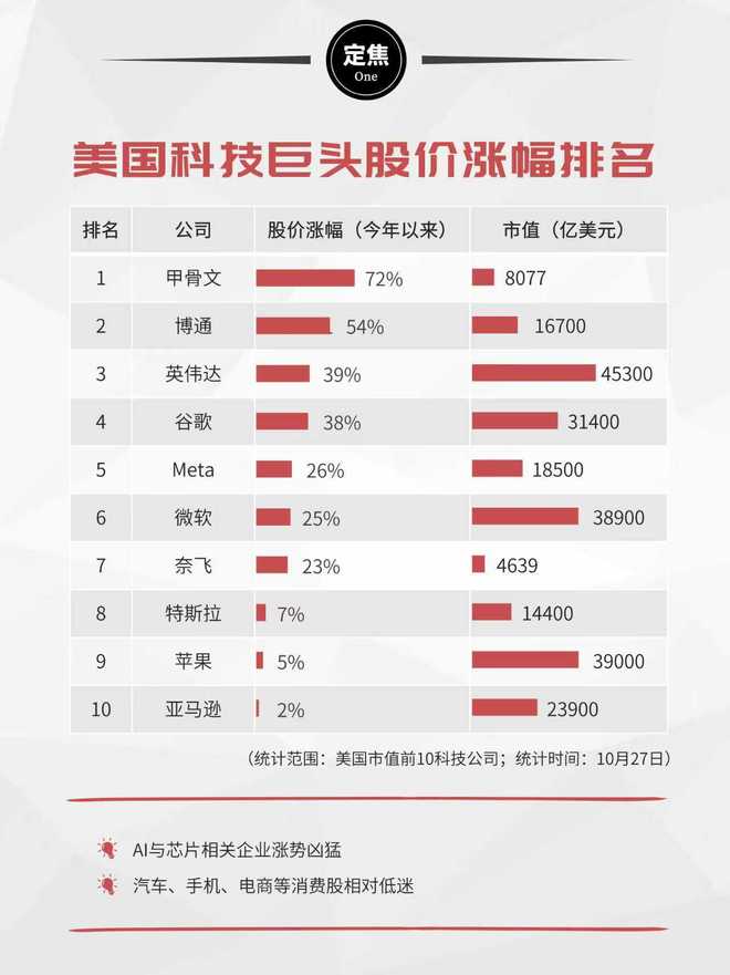 我们以“股价涨幅+财务硬实力”为双标尺,拆解中美两国市值排名前10的科技巨头: